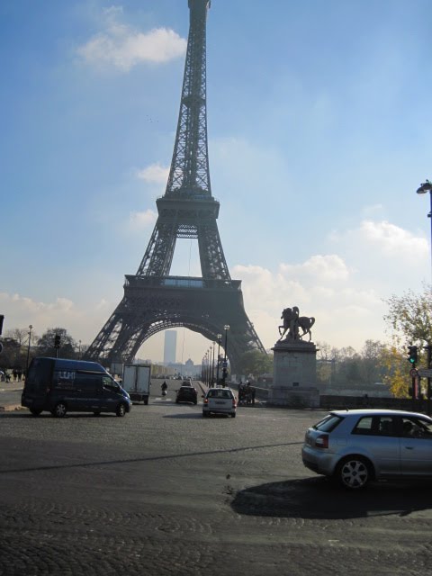 By the way,I love how you're capturing the autumn sky,and how it reflects on the Eiffel Tower and the park around it.When you enlarge that shot,it feels like you're there,taking a stroll,looking up toward the sky,through the color of autumn on the leaves.I also like the colors you captured,of the Tower looking very golden and erect,against the overcast sky.It's MAJESTIC!!! The light of the golden,setting sun,on the street below is also pretty (the one next to the leaf boys).The picture of the boat with all the holiday greenery,is beautifully framed with leaves...very nice! I have a question,who are the statues that reside in the garden near Le Louvre??? I'm coming back to this blog tomorrow,there's more to be said...tee